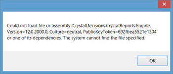 Could not load file or assembly 'CrystalDecisions.CrystalReports.Engine, Version=12.0.2000.0, Culture=neutral, PublicKeyToken=' or one of its dependencies. The system cannot find the file specified.