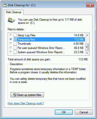 Once launched please make sure only the 'Temporary files' option is ticked, then click the OK button.