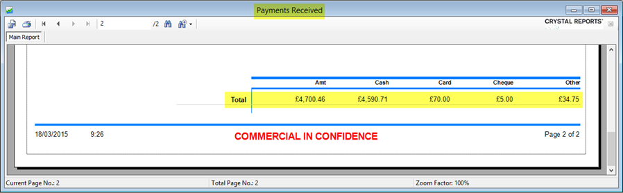 Here is a screenshot of the bottom of the "Reports > Finance > Payments Received" report, it shows the total of all payment types as well as the grand total for all payments received.