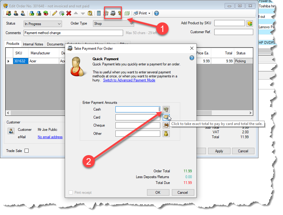 If you open the order in the back end (Orders & Quotes), you can click the Take Payment for Order button (1), and then click the button to the right of the Cash box (2) to take the full payment by cash and mark the order as paid.