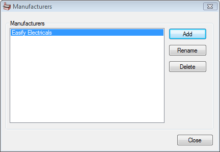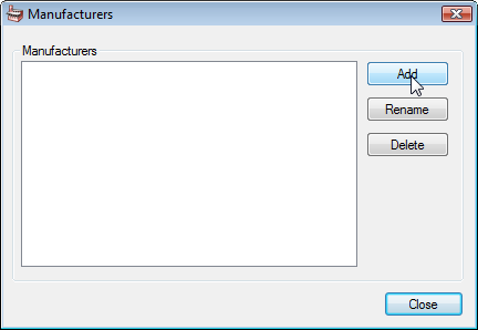 Note: You can add more manufacturers at any time by returning to this dialogue. You can also rename or delete manufacturers via this dialogue.