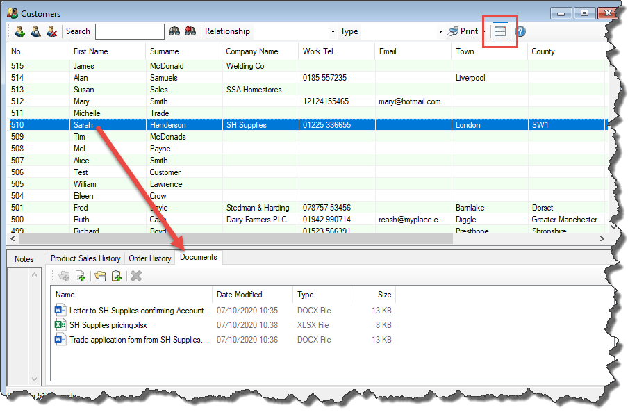 From the Main Customers window click on the Show/hide customer info pane button as highlighted in red to view the pane if it isn't already showing.