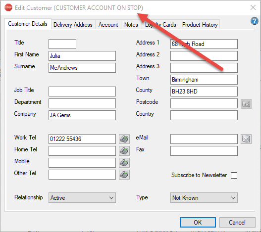 If the customer has been put On Stop their details will show in red in the main Customers window and a STOP sign will show when you open the customer details.