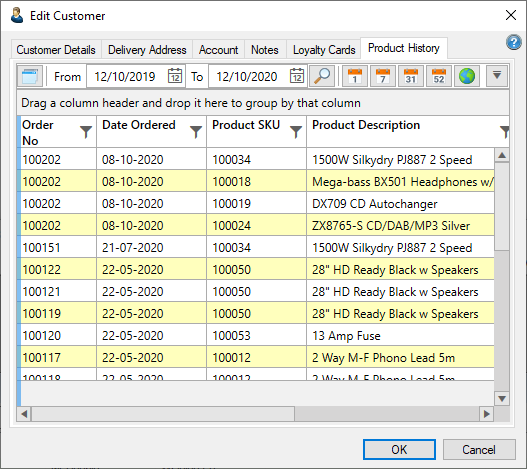 Details of the customer's previously purchased products are displayed on this tab. First select a date range, then click the Search (magnifying glass) icon to load the requested data.
