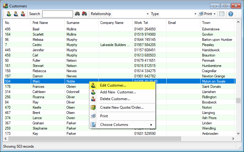 To edit a Customer Record, double-click on a customer from the main Customer window. Alternatively, right-click on a customer and select Edit Customer…. This will open the Edit Customer window.