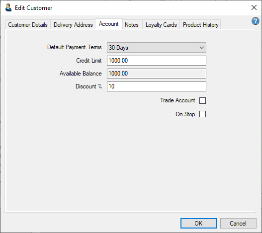 • Credit Limit: This is used to set a limit on how much the customer can purchase “On account” when using the POS. However an order will only show on a customer's account once it has been invoiced. It also determines whether payments are shown as Overdue when printing customer statements.