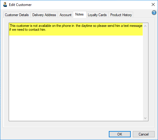 Enter arbitrary text on this tab to add notes to a customer record, and click OK to save your notes to this tab.