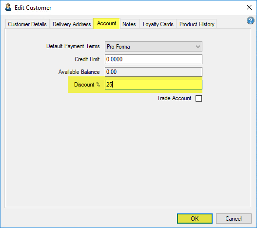 3: Click on the customer's Accounts tab, enter a value in to the "Discount %" field and then click OK to confirm the change