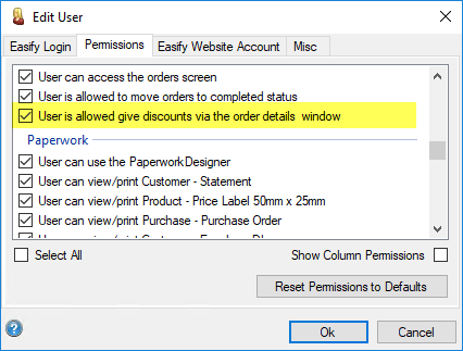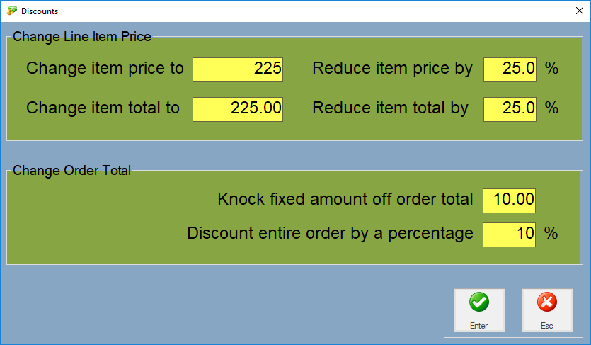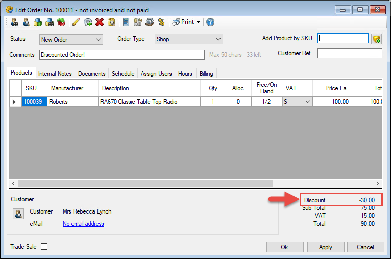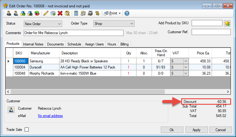 If you want to make any changes to the discount on an order, simply open up the order, click the Discount button and amend the fields as required.