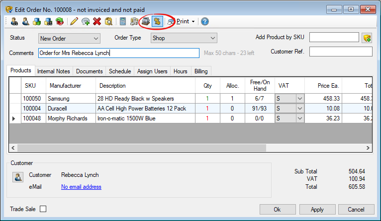 1: Open an existing Order via the Orders & Quotes window and click the Discount button