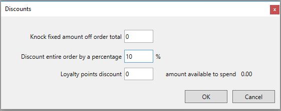 • Loyalty points discount: (Note: This option will only be visible if you have enabled Loyalty Points) Use this option if the customer wants to spend their loyalty points. Enter a money value, as opposed to the number of loyalty points you want to use (Easify calculates the amount the customer has to spend based on their accumulated loyalty points and displays that amount to the right of this field so both you and the customer know how much discount is available).