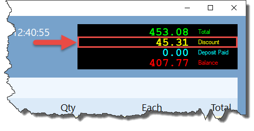 • The Discount value shows the amount of discount that has been deducted from the Total.