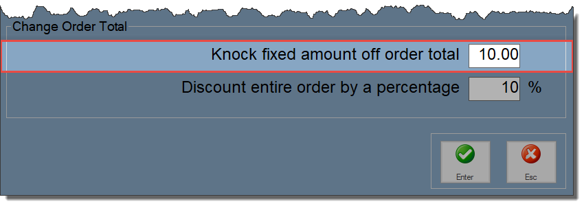• Knock fixed amount off order total: Use this option if you want to deduct a fixed amount from the order total. For example, if you enter 10.00 in to this field, Easify will deduct £10 off the order total.
