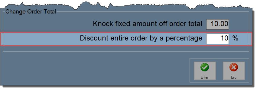 Discount entire order by a percentage Enter a value in to this field to apply a percentage discount to the whole order. For example, if you want to take 10% off the order total then you would enter 10 in to this field.
