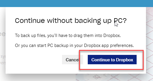 You will be warned by Dropbox to continue without backup up your PC. For now click Continue to Dropbox as you can always go back and change this later according to your preferences.