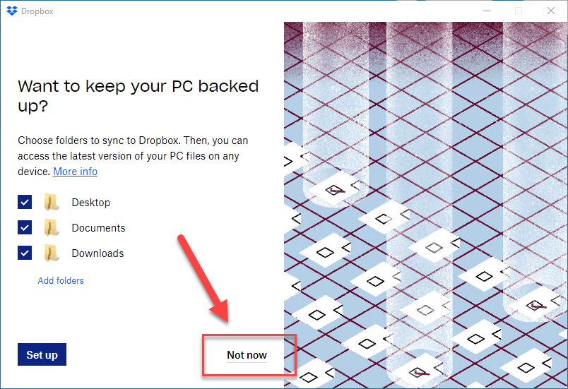 And on the next page click Not now to not setup a backup strategy for your PC. You would not want to do this if your using the same Dropbox account on multiple computers.