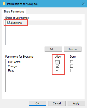For this demonstration we're giving the Everyone user full control of the shared DropBox folder. In a production environment you wouldn't usually grant everyone full control as it can represent a security risk, you would want to be more selective as to who you grant access to.