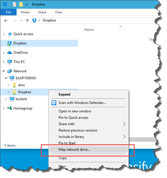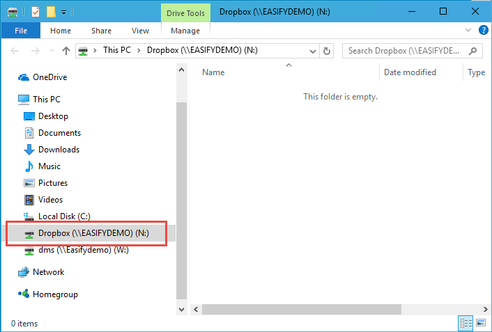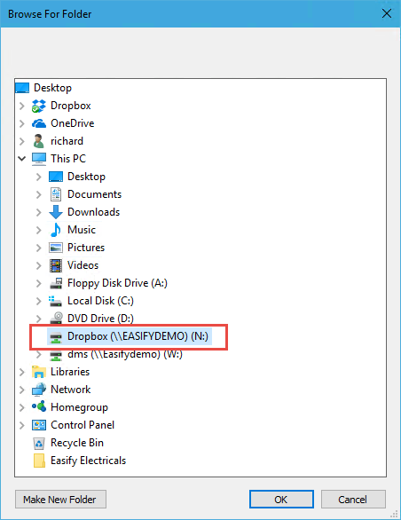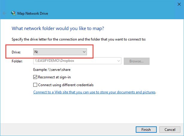 The drive letter should be mapped to the network share path that you determined above e.g. \\EASIFYDEMO\DropBox
