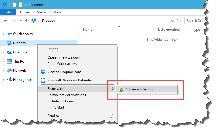 Next you need to share the DropBox folder in Windows so that it can be accessed by other computers on your local network. In this example we're using Windows 10, and depending on your network setup or which operating system you are using, what you see on your system may vary from what's shown below. However the principles are the same on all systems.
