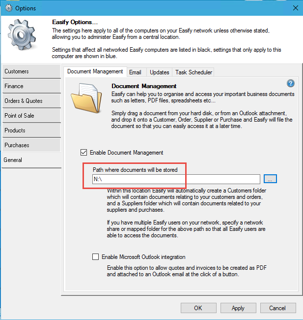 Before you start getting everything setup, remember that the Easify DMS simply stores files in a folder on a Windows based PC or laptop. You configure where this folder is in Easify Options.