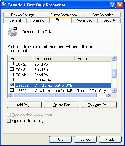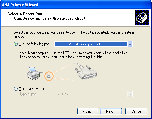 When asked to Select a Printer Port, choose the virtual printer port for USB that has the highest number. In this case the highest numbered virtual printer port is USB002. Then click Next.