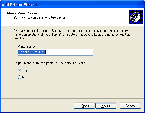 When asked to Name Your Printer, we recommend you keep the default name of Generic / Text Only. But you can change this to something more meaningful if you wish. Click Next.