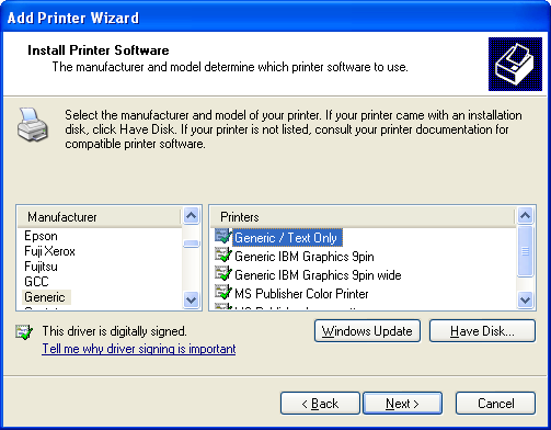 In the Install Printer Software dialogue, select the Generic manufacturer and then the Generic / Text Only printer. Click Next.