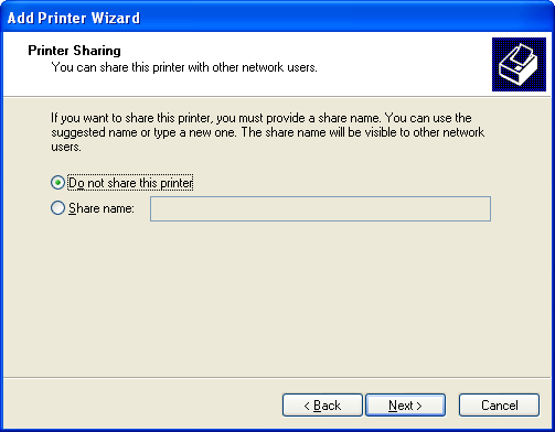 In the Printer Sharing dialogue, choose Do not share this printer. Click Next.