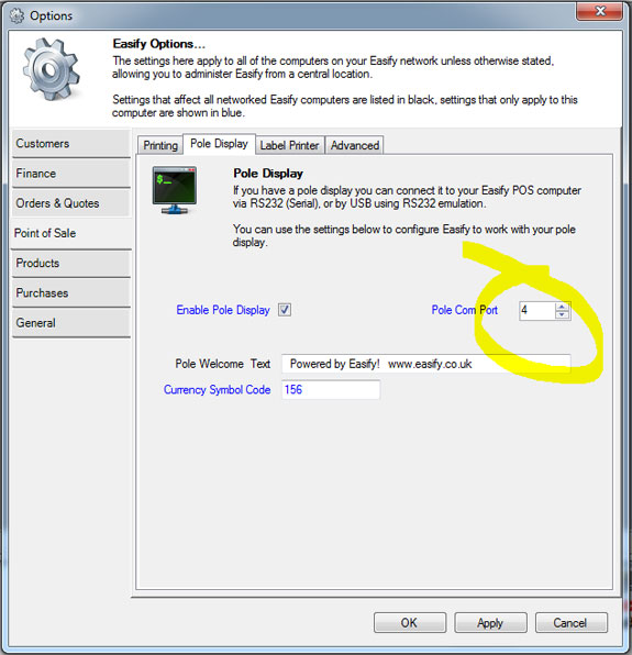 Locate the Point of Sale tab, and within the Point of Sale tab select the Pole Display tab.