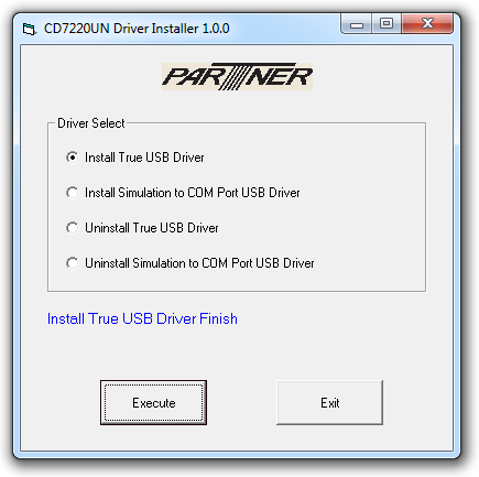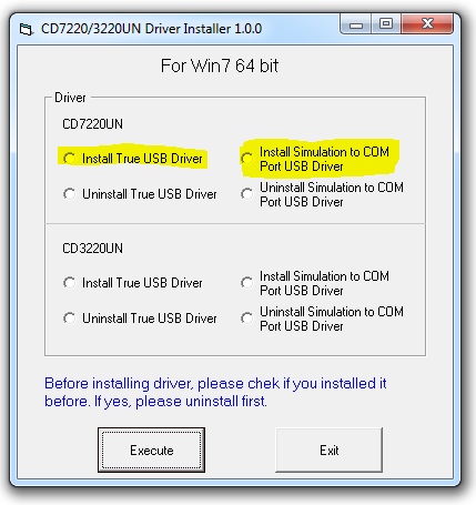 First, in the CD7220UN section select Install True USB Driver and click the Execute button.