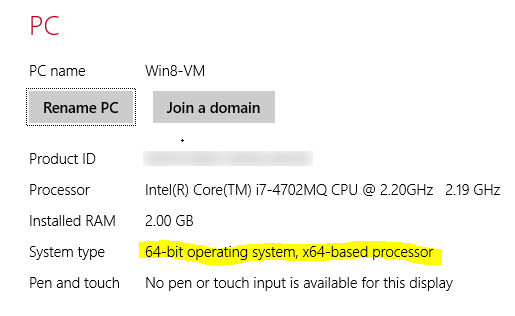 In the next Window have a look at the System Type as highlighted in yellow below. This will tell you if you have a 32 or 64 bit installation of Windows.