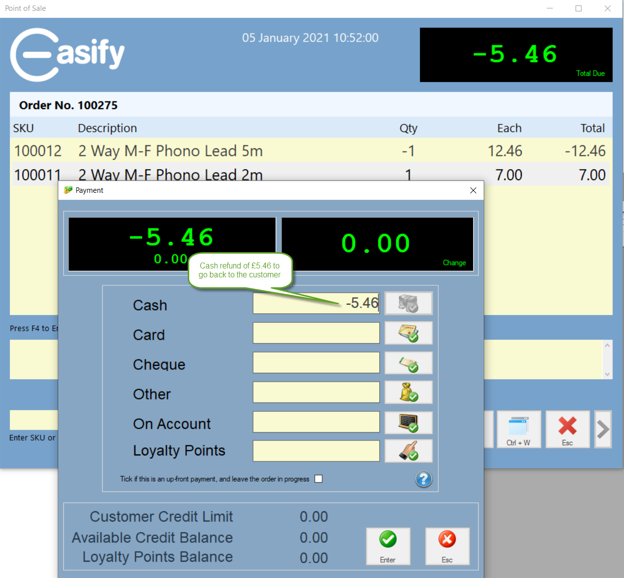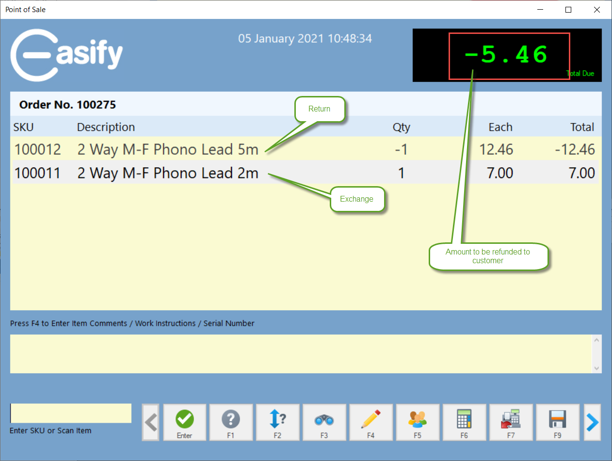 In the scenario below you can see that a 5m Phono lead has been returned and exchanged for a 2m Phono lead. As the 5m lead was more expensive there is a cash refund of £5.46 to go back to the customer.