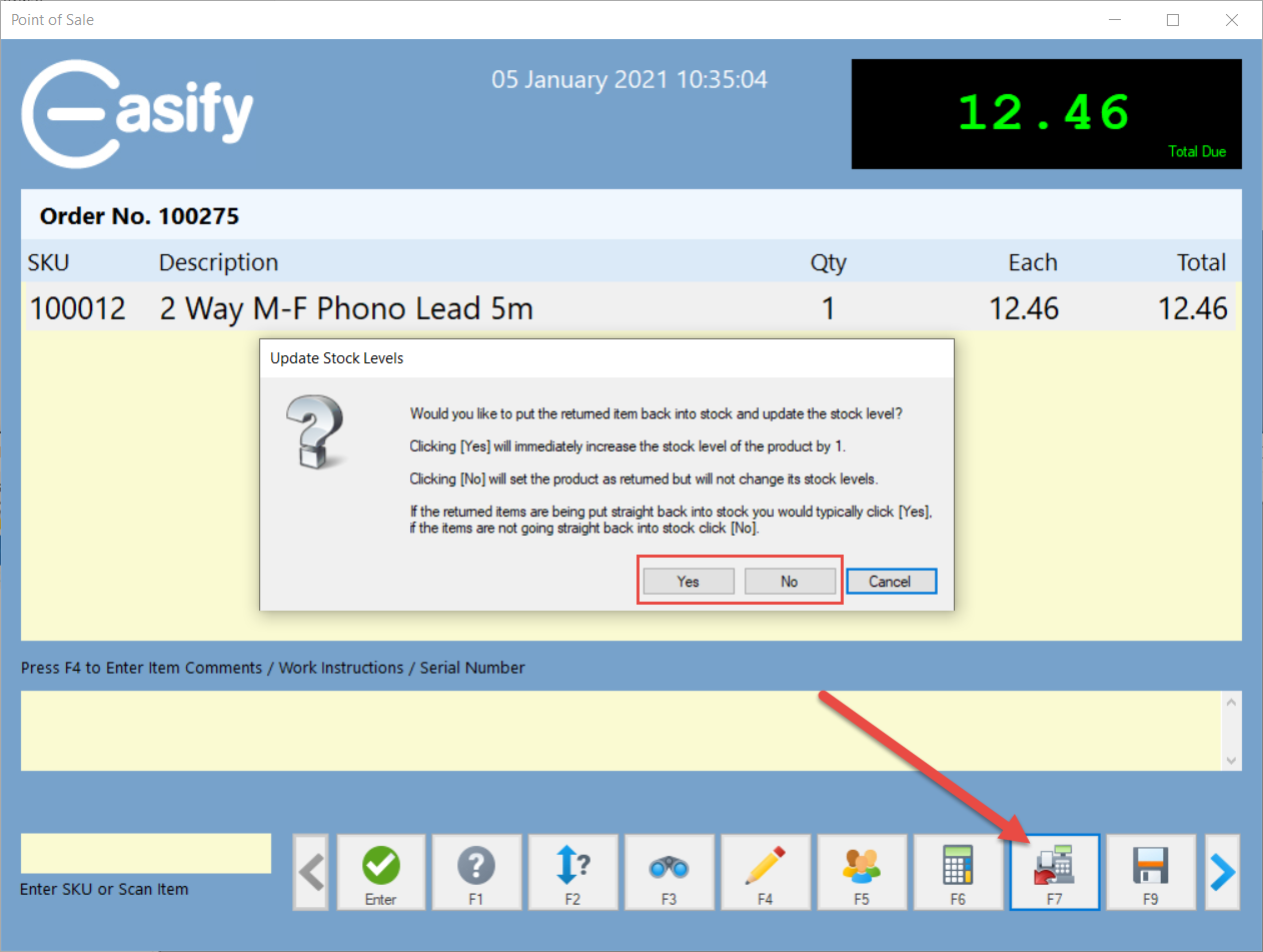 • If you click No Easify will set the product as returned but will not change its stock levels.