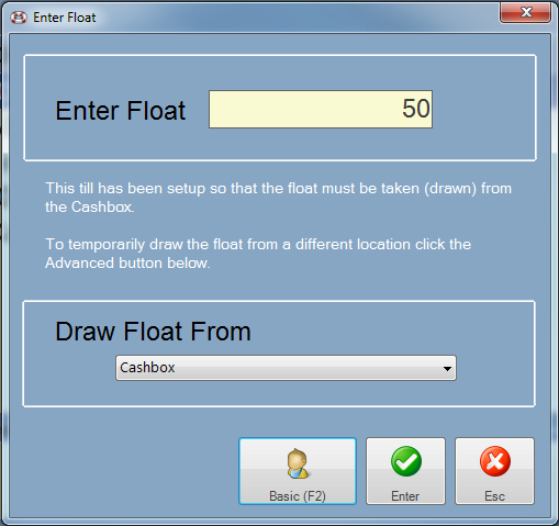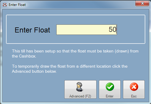 Enter the amount of the float that you will be putting into the till and click the Enter button when done.