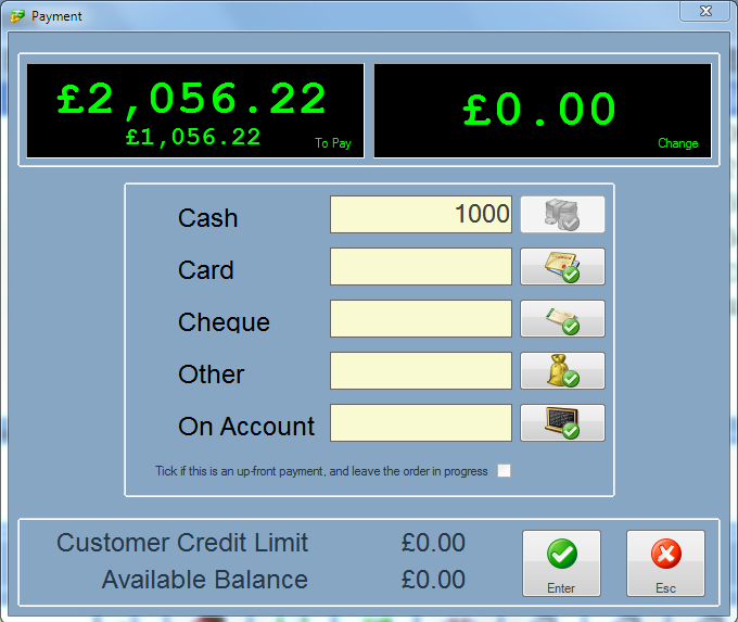 If you want to take full and exact payment for the sale and close the sale with a single click simply click the button alongside the payment method that the customer is using to pay in full.