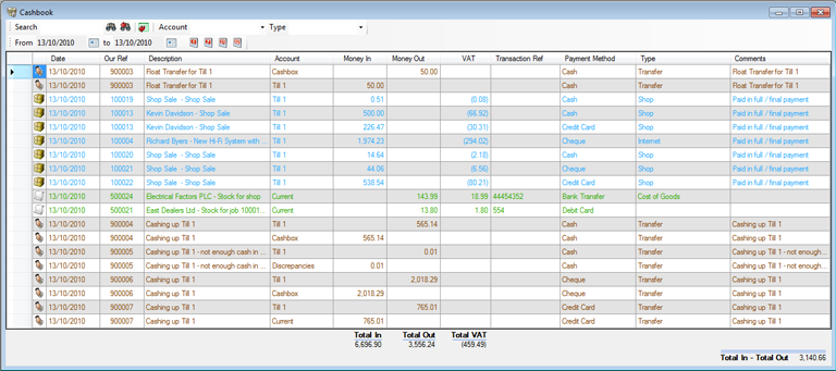 There is also a Type drop down list that you can use to filter the cashbook to show only Sales, Purchase or Transfers. You can also filter the cashbook to only show a specific type of Sale or Purchase.