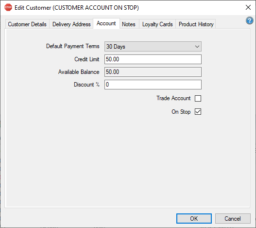 EAsify won't stop you from raising orders for this customer, however if you enable Active Credit Control in Easify Options, you can choose whether an "On Stop" account will be allowed to continue to pay for sales at the POS.