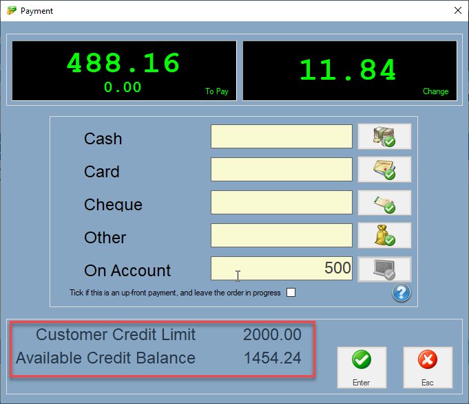 You can configure credit control to simply display the credit balance of a customer, or to enforce Active Credit Control rules that prevent them from going beyond the credit terms you have given them.