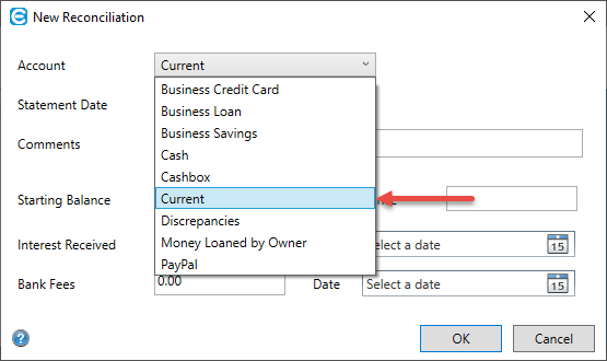 Select the account you will be reconciling. Remember you’ll need to complete the steps listed under How to get ready for your First Reconciliation first.