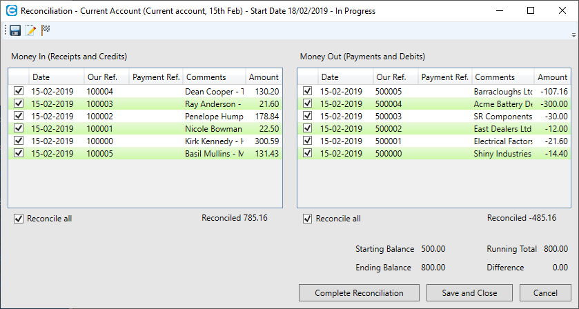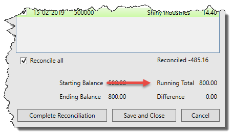 When you’ve ticked all the transactions in the Reconciliation window that are shown on your bank statement, your Running Total should be the same as your Ending Balance. If that is the case, then you’re ready to select ‘Complete Reconciliation’.