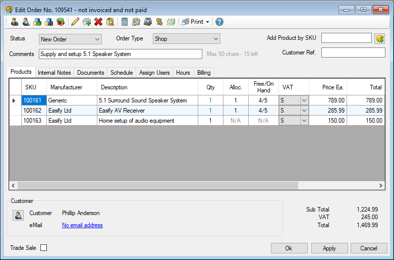A fictitious company, Easify Electricals, supplies complete surround sound systems to customers as well as offering an accompanying home setup service. A typical order for one of their customer's may look like this: