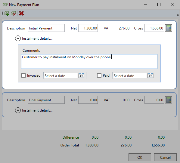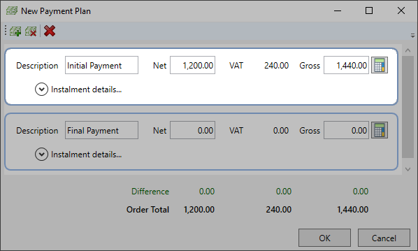 Gross: Enter a Gross amount payable for the Instalment. The VAT value and Net field will adjust accordingly after you click or tab to another area in the window.