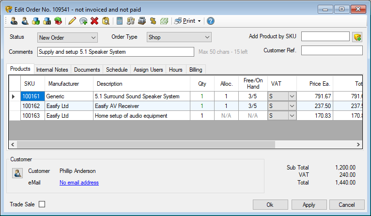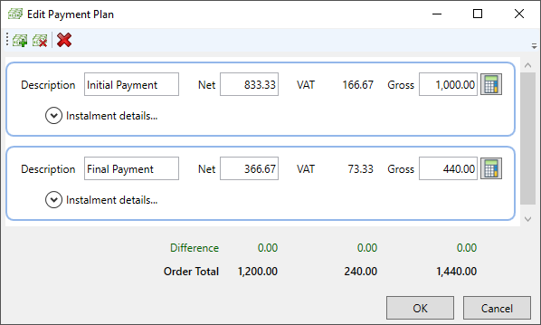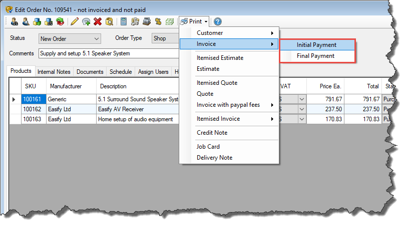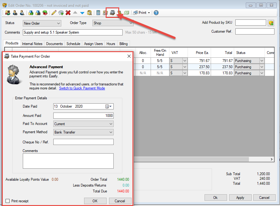 If a customer makes a payment of £1200, Easify will record the first £1000 on the Initial Payment and mark it as "Paid". Then it will record the remaining £200 of the customer payment against the Final Payment. However, it won't mark the Final Payment as "Paid" until the outstanding order balance (£240) has been paid for.