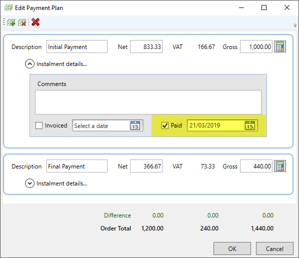 NOTE: Just ticking the Paid box on a payment plan *will not* record the payment. You have to process the payment using either the Point of sale or the Take Payment for Order window as shown below: The same applies to Payment Plans on Purchases too.