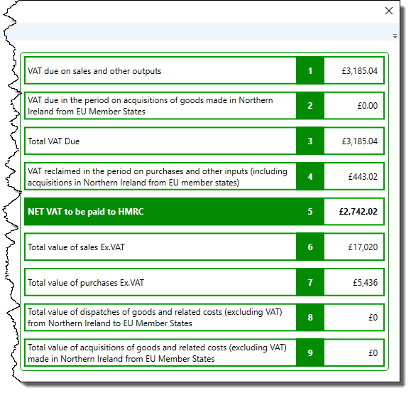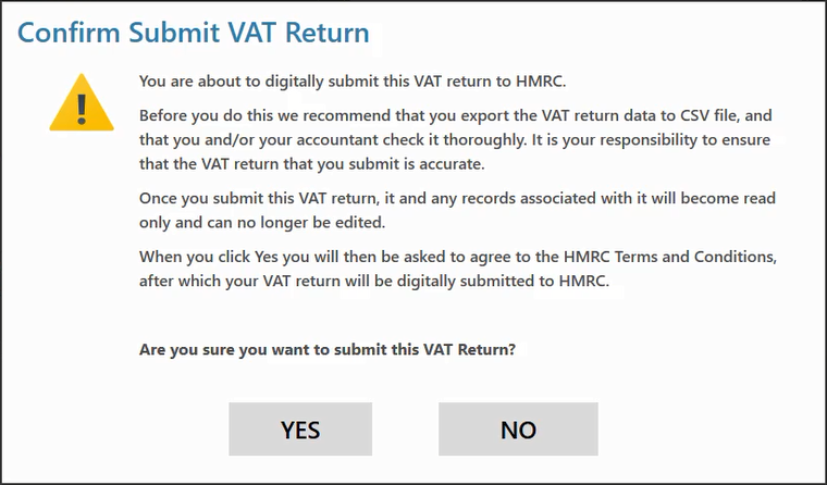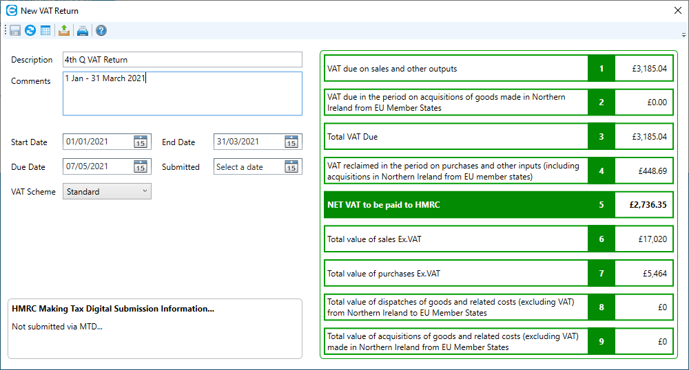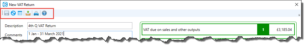 Clicking this button will print a copy of your VAT Return. If you are using MTD we recommend printing your VAT return after you have submitted it as it will have the submission data from HMRC at the bottom of the VAT Return.