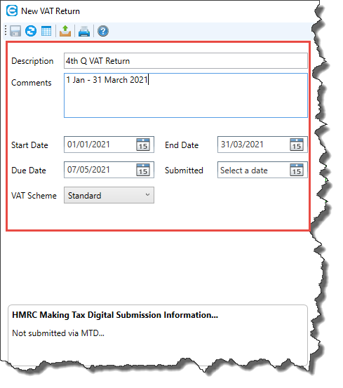 If you are using MTD and have obtained your VAT return from HMRC, a description will already have been inserted, however you can over-type it if you prefer.