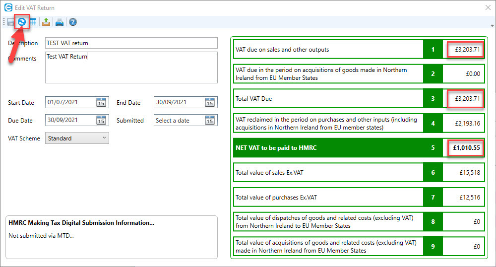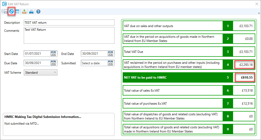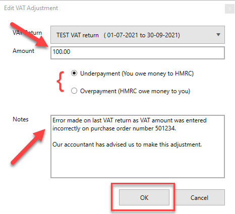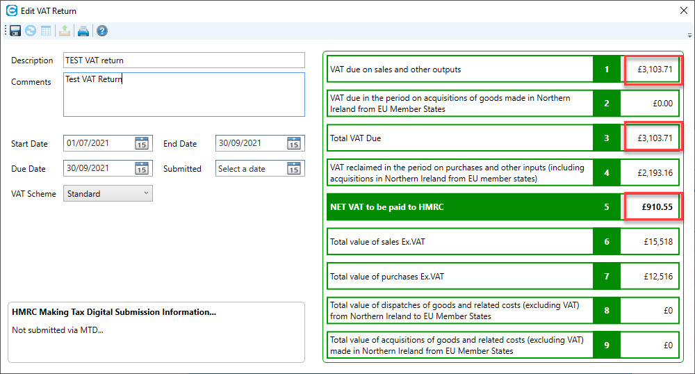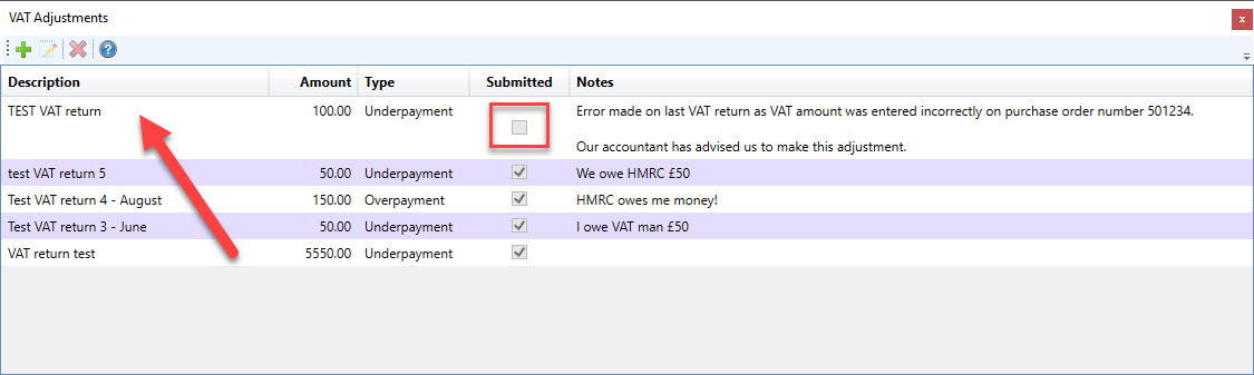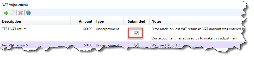 For example: This is a Test VAT return showing the amounts owed before we have recalculated to include the £100 VAT underpayment adjustment.