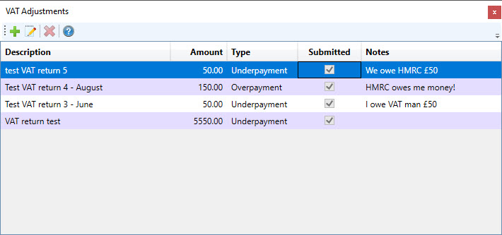 The screen shot below has been taken from one of our test databases, and so far four test VAT adjustments have been entered. As this is a test database, the notes recorded against the adjustments don't provide much useful information, however in a real life scenario, the notes recorded against the adjustments should be more descriptive.