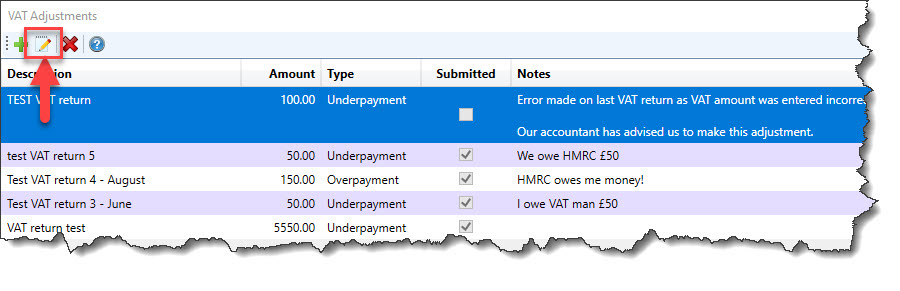 This will bring up the Edit VAT Adjustment window we've just seen above. Make any necessary amendments and click OK to save your changes.