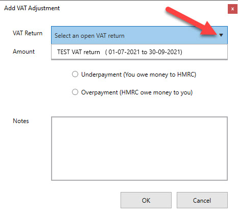 Click on the Drop down arrow next to the VAT Return field to select a current VAT return to apply the adjustment to: